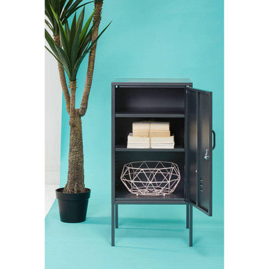 This one door metal cabinet is a compact and versatile storage solution for minimalist and modern homes and offices. The inner shelves are adjustable to store a variety of items from documents to storage canisters. The door of this grey powder coated cabinet features a locker for security and a metal handle allowing you to conveniently access the content inside.