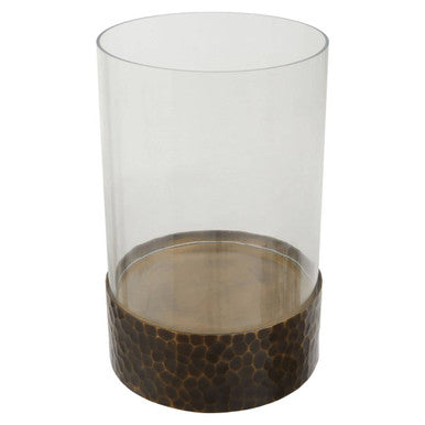 A tall hurricane-style glass sleeve protects the flame and amplifies candlelight for a steady, soothing shimmer. The metal base is finished in antique gold and worked with a subtle hammered texture that catches scattered light.