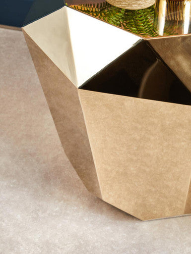 The Allure end table creates a striking diamond shape out of smooth stainless steel. It features a hexagonal tabletop, with a series of triangular shapes beneath that correspond with its tapered base. It boasts a reflective champagne gold colour, making it a luxurious addition.