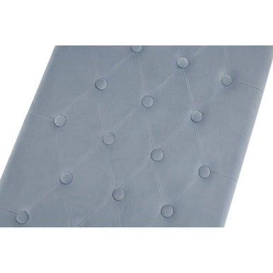 The plump cushion is dressed in soft velvet, with a button tufted finish that creates a quilted finish. The base is made from smooth stainless steel and boasts a reflective gold finish that complements the upholstery. Angled lines dart across the base, adding a little bit of geometric design to the aesthetic.