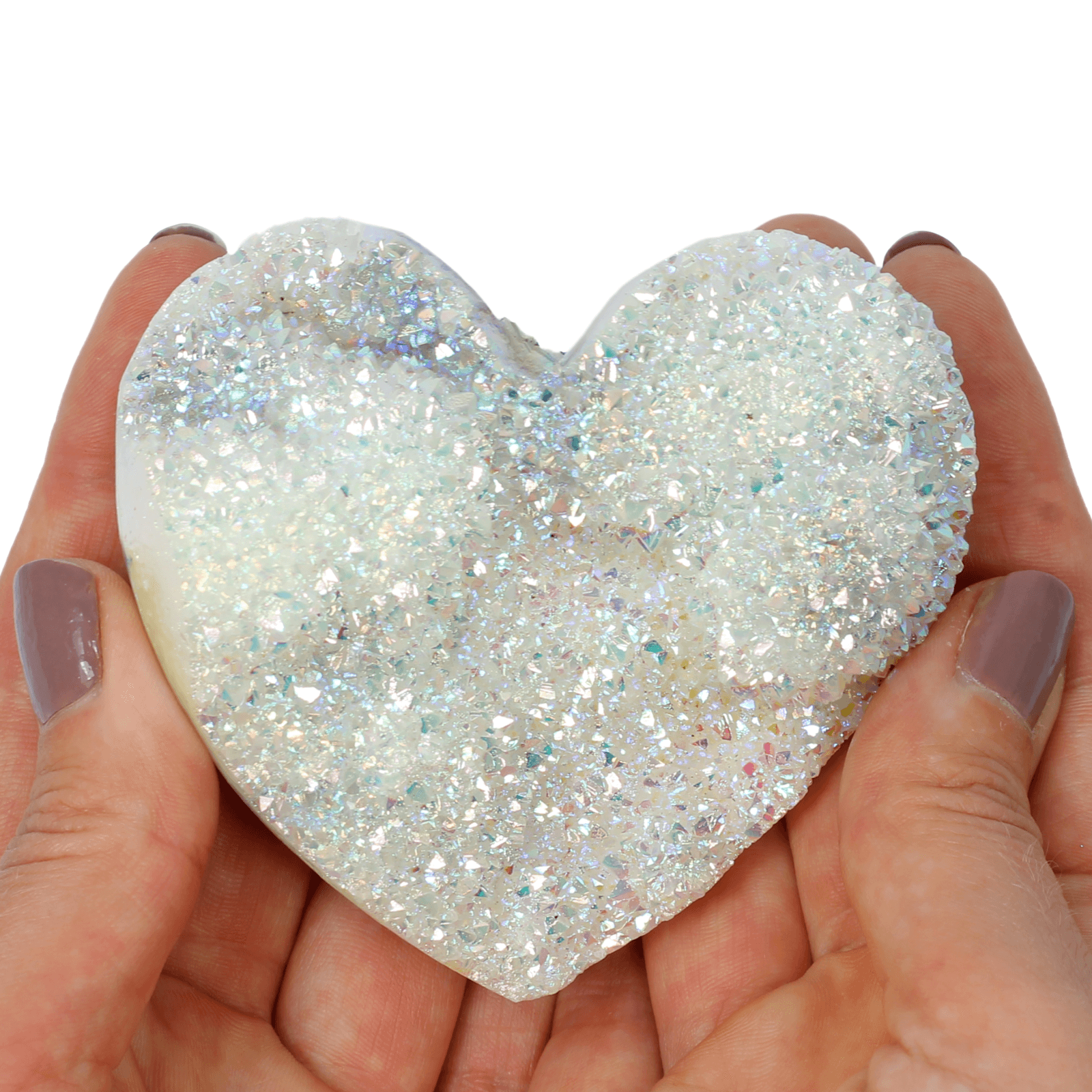 This beautiful Angel Aura Heart is a gentle and uplifting crystal, shimmering with soft iridescent colours that catch the light with every movement. Created by bonding clear quartz with precious metals such as platinum and silver, it carries a high, angelic vibration believed to promote inner peace, spiritual connection and emotional healing. The heart shape enhances its loving energy, making it a thoughtful gift or a soothing addition to any sacred space. Often used in meditation or simply kept nearby, this crystal inspires calm, positivity and a deeper sense of harmony within oneself and the surrounding environment.