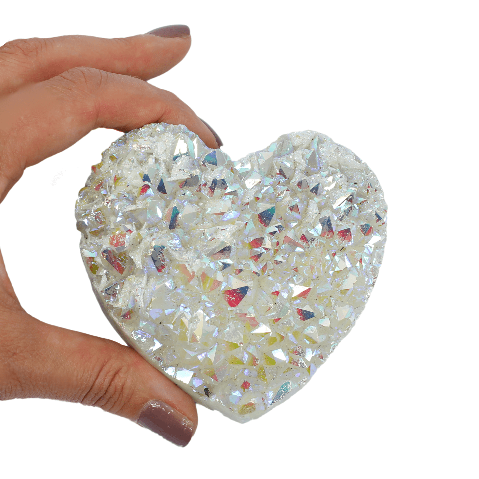 This beautiful Angel Aura Heart is a gentle and uplifting crystal, shimmering with soft iridescent colours that catch the light with every movement. Created by bonding clear quartz with precious metals such as platinum and silver, it carries a high, angelic vibration believed to promote inner peace, spiritual connection and emotional healing. The heart shape enhances its loving energy, making it a thoughtful gift or a soothing addition to any sacred space. Often used in meditation or simply kept nearby, this crystal inspires calm, positivity and a deeper sense of harmony within oneself and the surrounding environment.