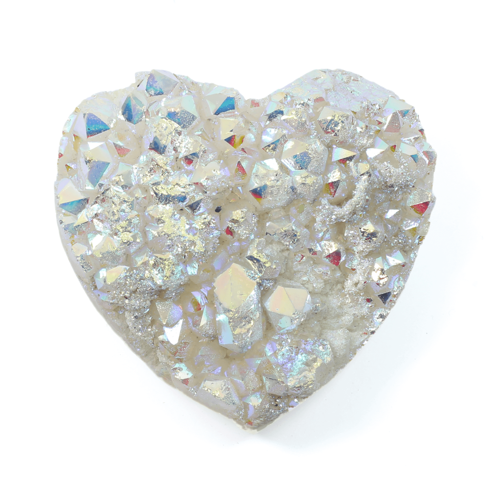 This beautiful Angel Aura Heart is a gentle and uplifting crystal, shimmering with soft iridescent colours that catch the light with every movement. Created by bonding clear quartz with precious metals such as platinum and silver, it carries a high, angelic vibration believed to promote inner peace, spiritual connection and emotional healing. The heart shape enhances its loving energy, making it a thoughtful gift or a soothing addition to any sacred space. Often used in meditation or simply kept nearby, this crystal inspires calm, positivity and a deeper sense of harmony within oneself and the surrounding environment.