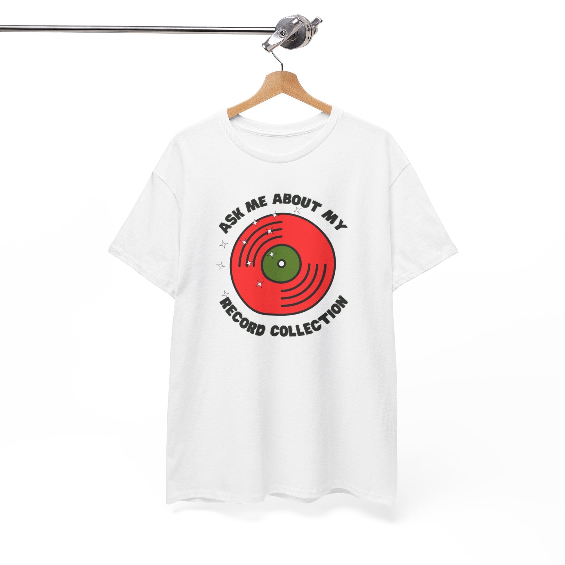 Ask me about my record collection (please)! Show your love for vinyl records with this fun and comfy tee. The classic fit makes it perfect for music enthusiasts and fans of retro style. Ideal for casual wear or music events, this tee is durable and suitable for everyday wear or concerts.