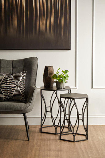 This pair of contemporary tables use tough iron to create decorative symmetrical patterns. Hourglass shapes coalesce with oval motifs beneath the polygonal tabletops and above the polygonal bases. The combined result is a pair of fluid accent pieces that