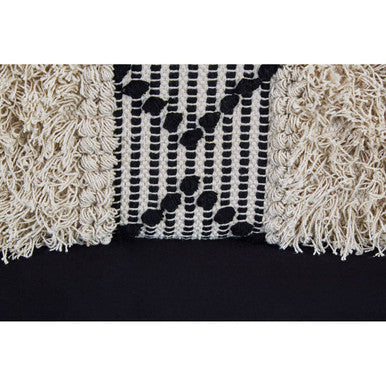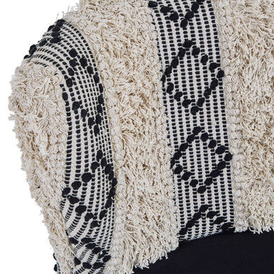Inspired by Moroccan design, this bench has a padded black velvet seat. The woven textile backrest features black and white geometrical patterns, creating a striking blend of textures and styles. The bench is supported by slanted mango wood legs in a natural finish, offering style and stability.