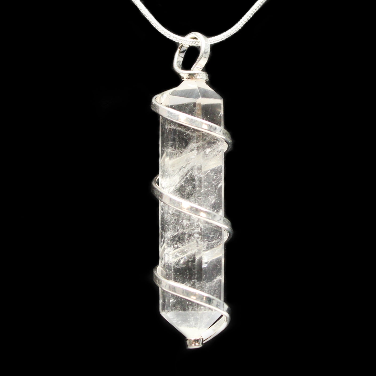 A Quartz Double Terminated Point crystal wrapped in a silver spiral casing to keep it safely in situation as you wear it. Quartz is a crystal high in its spiritual vibration and excellent at unblocking and regulating energies.