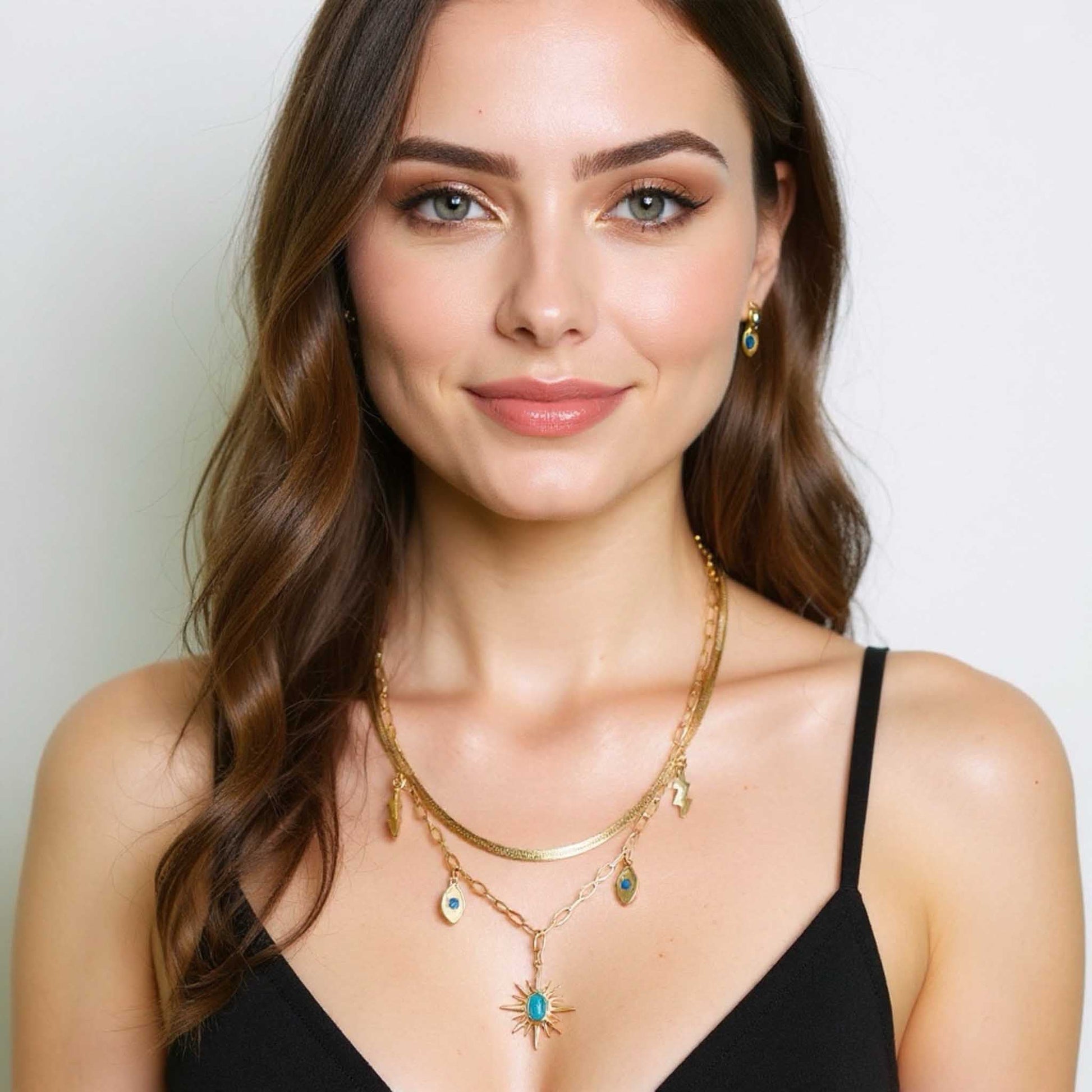 Make a statement in sophisticated opulence with the Cleopatra 18k Gold Plated Necklace. Crafted with a timeless sunburst pendant adorned with evil eye and lightening charms, this necklace has been specially designed to enhance any look with its iconic layered effect. Be the queen of style with this timeless piece.