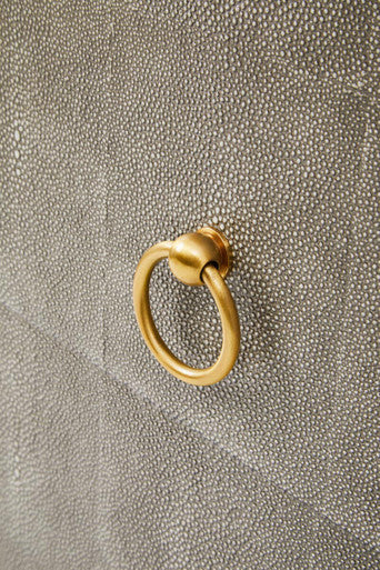 The tactile shagreen-effect door fronts introduce luxurious texture, while the gold-tone base adds a subtle glow that pairs beautifully with warm lighting and metallic decor.