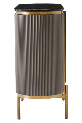 A dark marble top crowns the design, offering a sophisticated surface for vases, bowls, and statement lighting. The black, wood-effect body features elegant fluting that catches the light, while gold-tone borders and legs complete the modern profile.