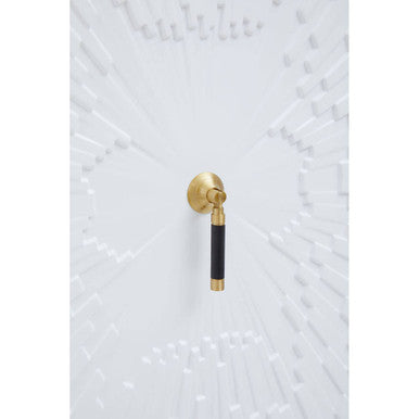 Add architectural presence and practical storage with the Dumas Two-Door Cabinet. This black and white cabinet features subtly patterned doors that catch the light, while gold knobs and a coordinating gold base introduce a polished, gallery-inspired finish.