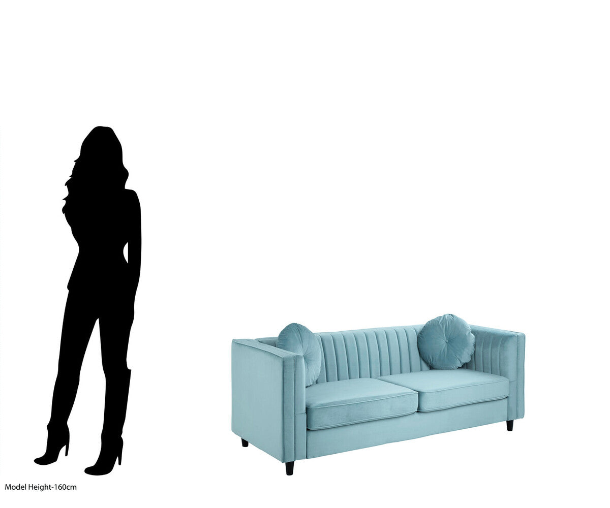 The Farah pastel green velvet sofa features a tuxedo design with a back that is level with the armrests. The pleated detail on the back enhances the sofa's visual appeal. The sofa is supported by eucalyptus wood feet.