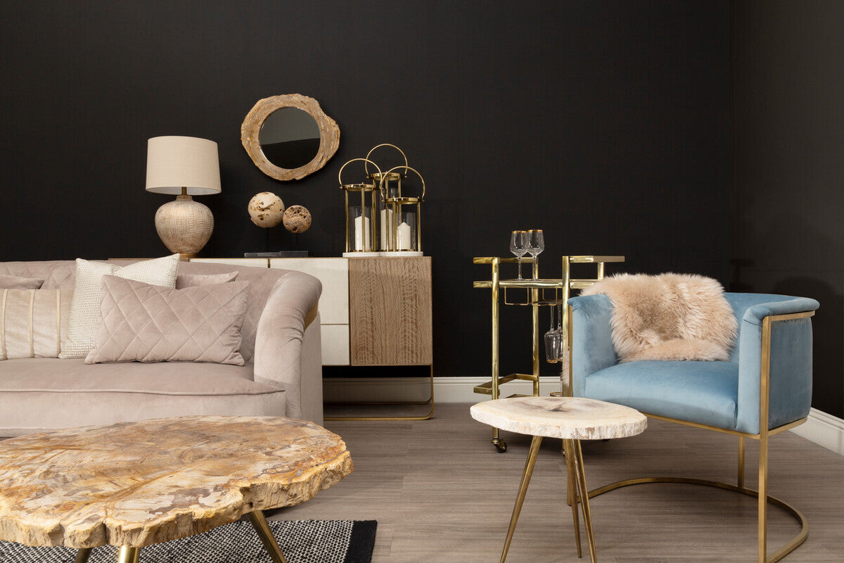 This light grey cotton velvet sofa introduces a curved back with a gold finish band at its exterior. The inner back with matching cushions elevates a decorative quilted texture. Orb feet contrast the luxe upholstery and further the elegance.