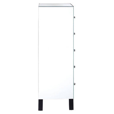Each of the five drawers feature transparent cut-glass handles that are faceted to enhance their luxurious appeal. A mirrored finish amplifies the table's opulent aesthetic, while curved black feet add a dark counterpoint. Complementing the arched feet, the bottom drawer features an undulating bottom.