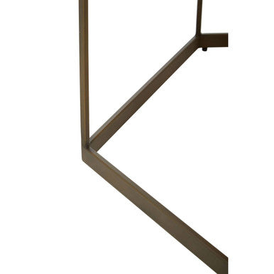 This coffee table features a sleek hexagonal oak veneer top sitting neatly on a minimalist steel frame. The brushed brass finish provides a monochrome contrast to the wood top.