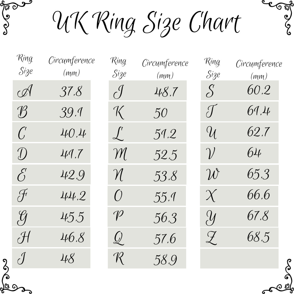 Rings are available in a variety of sizes which can be selected from the menu. Ring Chart below to guide for sizing if you are not aware of which size ring you are