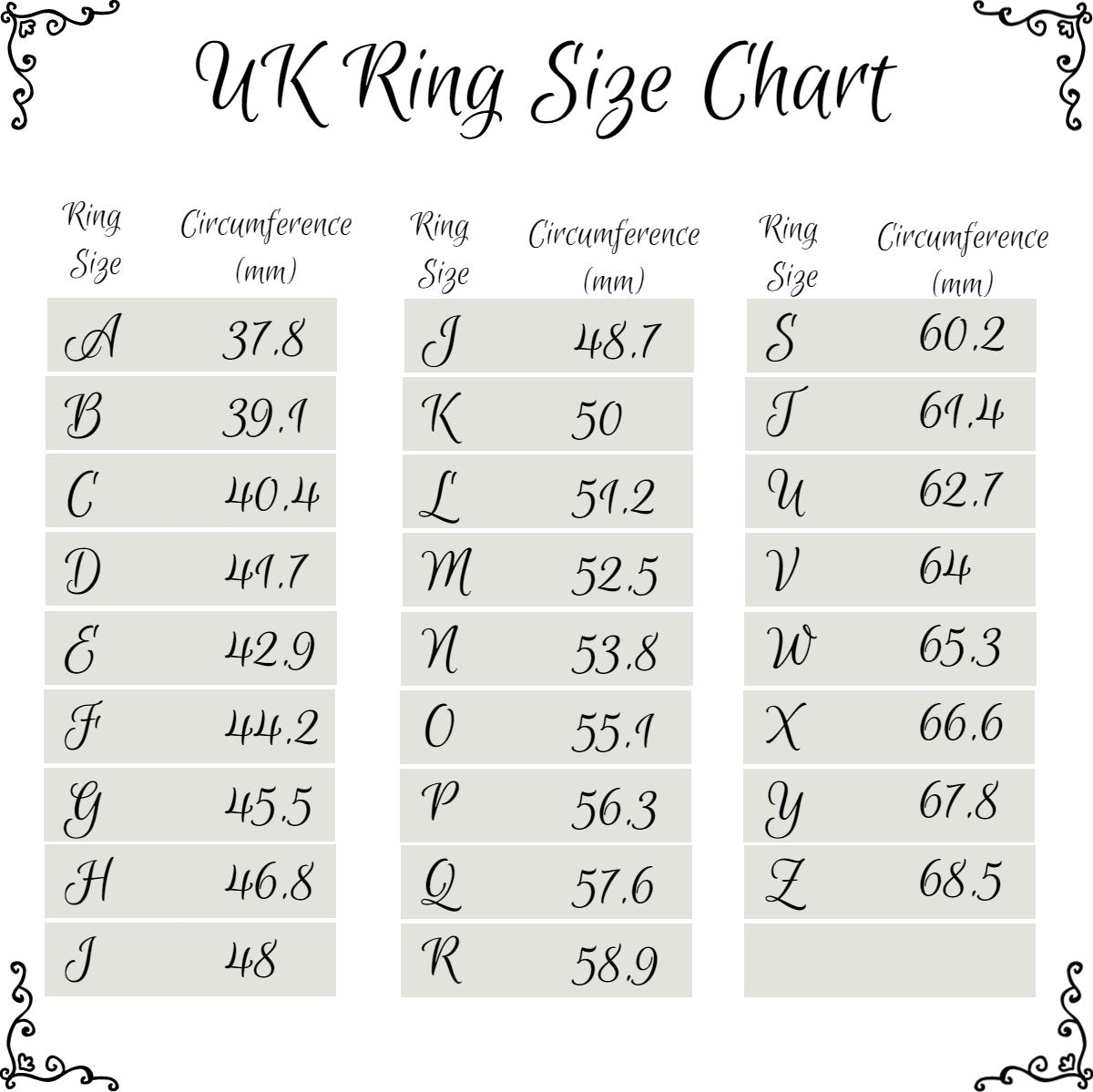 Rings are available in a variety of sizes which can be selected from the menu. Ring Chart below to guide for sizing if you are not aware of which size ring you are.