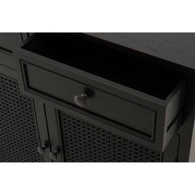 This wooden sideboard offers ample storage with two doors and two drawers complemented by knob handles and intricate cane weave. With its timeless aesthetic in an antique black finish, this sideboard will bring sophistication to any space.
