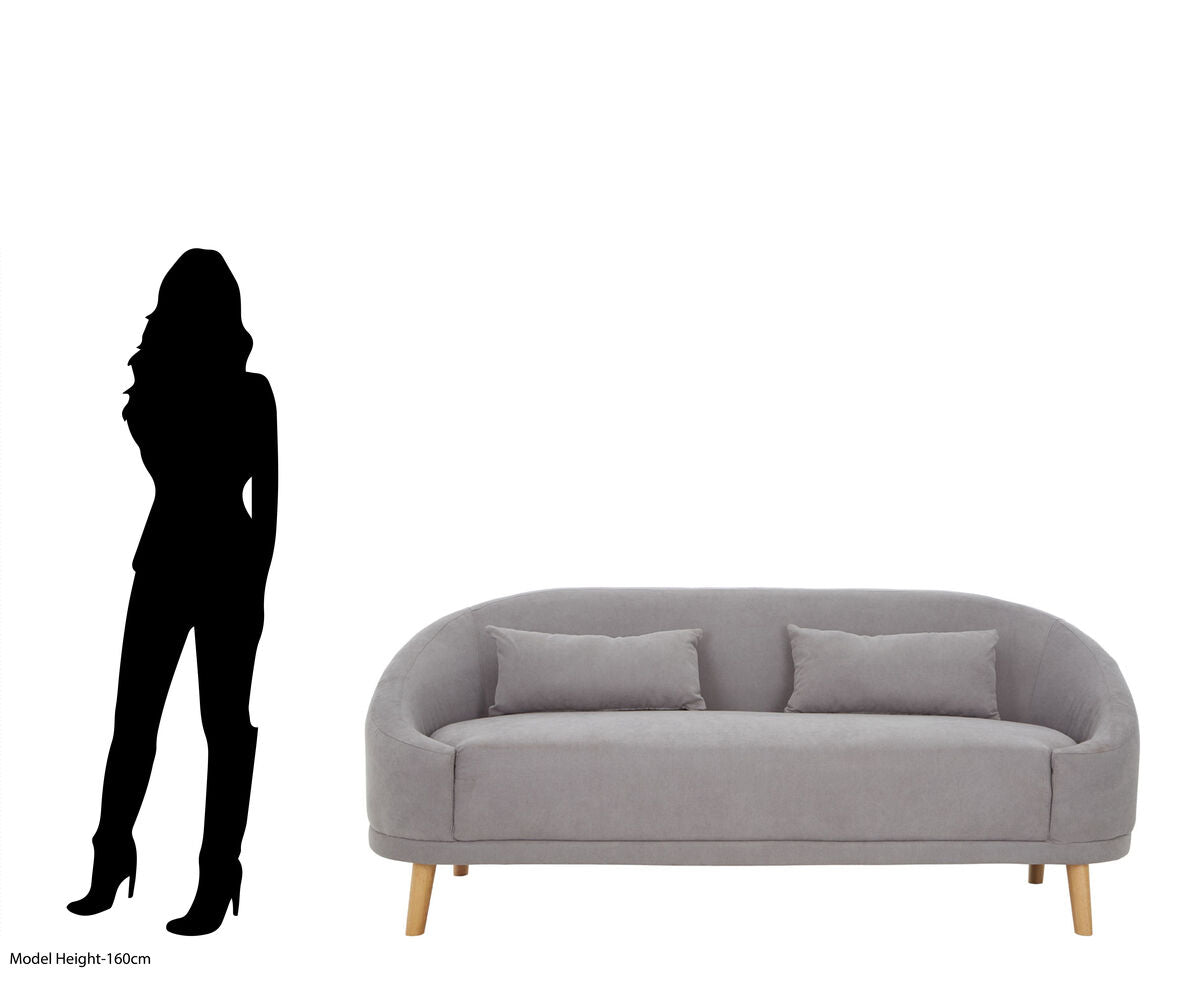 This stylish sofa is upholstered in grey linen, featuring a two-seater design with matching cushions to offer a comfortable seating experience for everyday use. The sofa has discreet stitching along the back, sides, and front, while the thick padded seat with a gently curved backrest is supported by durable, natural-finish wooden legs. This modern sofa will complement a variety of interior settings.