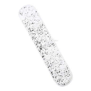Made from soft cotton, the heat resistant Hygge double oven glove has a black underside that counterpoints the white top. The dark underside is richly textured and has been quilted, creating a modern diamond pattern on the fabric. The upper is a clean white colour, decorated by a contrasting black splatter effect.