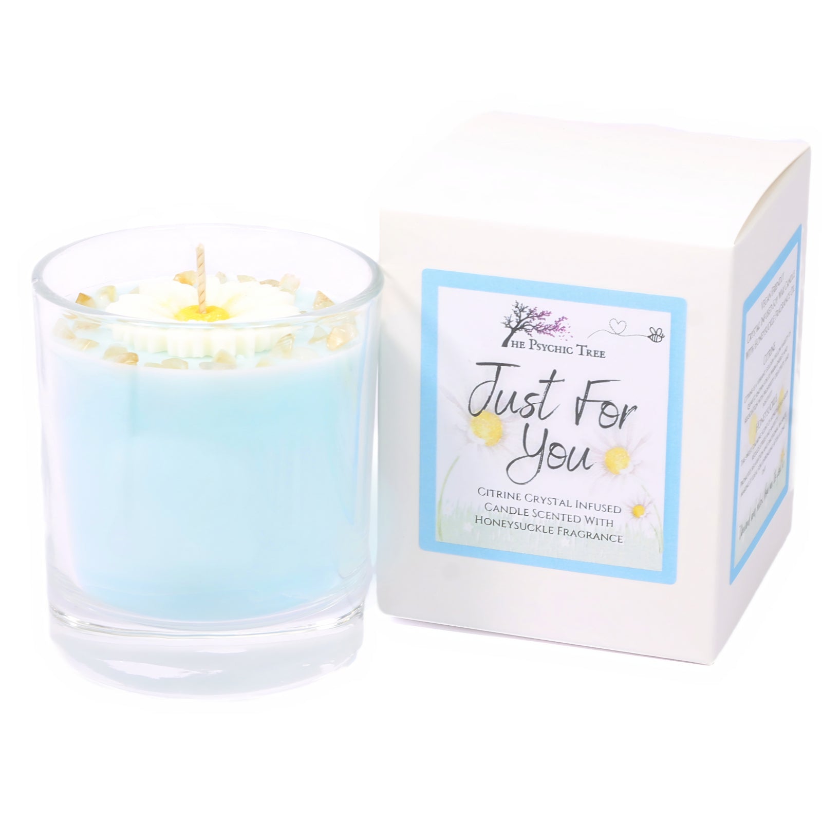 Show your love and appreciation with the "Just for You" candle, an enchanting gift that embodies warmth, beauty, and a touch of serenity. Made from pure soy wax and scented with an amazing Honeysuckle fragrance, this soothing candle is infused with citrine crystal chips, known for their uplifting and positive energy. Its soft blue hue creates a calming atmosphere, while the delicate daisy flower molded from wax on top adds a unique, floral touch that evokes love and joy.