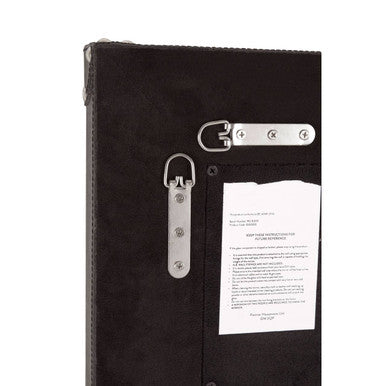 This wall mirror makes a stately impression with its use of materials and classic design. The soft leather frame has a black finish and is complemented by strap detailing on each side. Metallic accents add a reflective touch to the look.