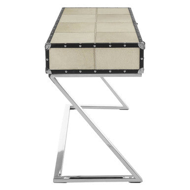 This luxury console table's frame is made from sustainable mango wood. The leather's light hue is offset by the black leather strips that trim the sides. Stitching features on its sides, and the top section where it produces a grid pattern. Both drawers feature leather strap handles, and the stud detail complements the polished stainless steel Z-shaped legs.