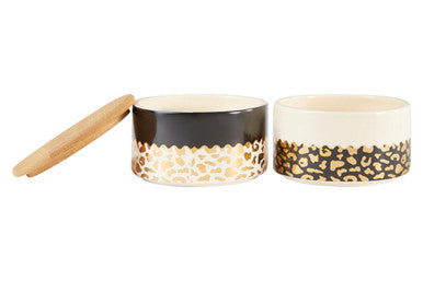 The London Leo stacking canister is crafted from durable ceramic. The two sections are easily stackable over each other and a natural bamboo lid is used to seal of the top. Beautiful black, gold, and cream hued paaterns add a luxe appeal to the smooth ceramic surface.