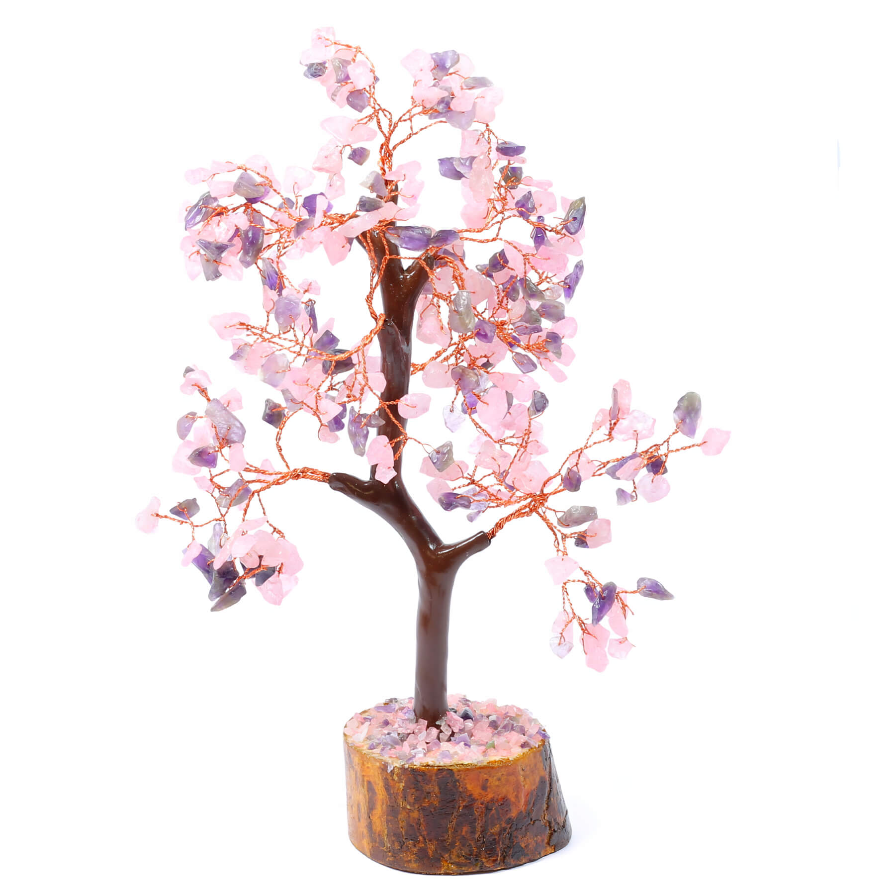 Embrace the gentle energies of love and serenity with the Love & Peace Crystal Chip Tree, carefully handcrafted with Rose Quartz and Amethyst crystal chips.
