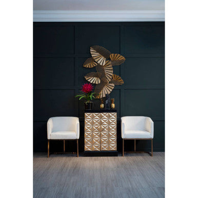 Crafted from sustainable mango wood, the Malta bar unit features a dark finish and subtle grain patterns. Two distinctive doors feature a unique, three-dimensional geometric pattern that is finished in a luxurious gold tone. Inside the bar unit are a plethora of storage compartments designed to store barware, glassware and drinks bottles.