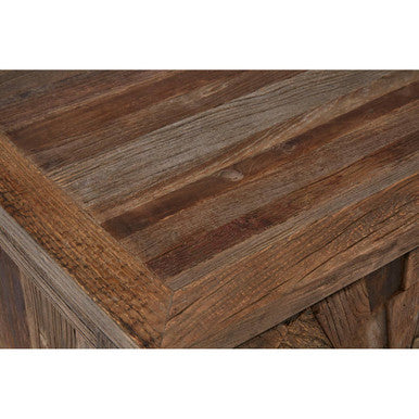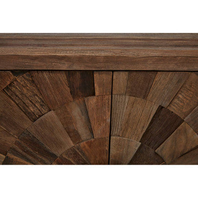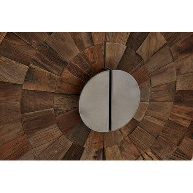 The doors are closed of this modern cabinet, and the handles form a full circle that complements the surrounding textured pattern. The differently coloured strips of elm wood enhance the cabinet's visual appeal.