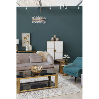 This cabinet is made of sturdy concrete plywood that ensures durability and features two spacious shelves within the cabinet. The brushed gold finish stainless steel hardware adds an opulent touch and contrasts the white wood.
