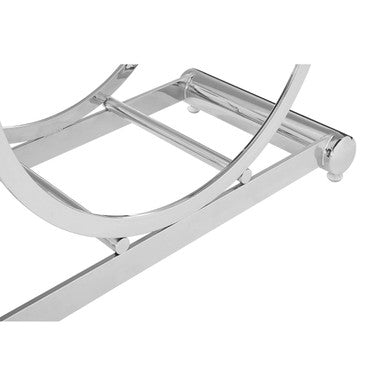 This luxurious console table is a contemporary combination of straight and rounded lines. Its rectangular top is made from black tempered glass which is set into a thick stainless steel frame. The top's round corners complement the circle that sits beneath. This large circle rests upon a base made from polished stainless steel.