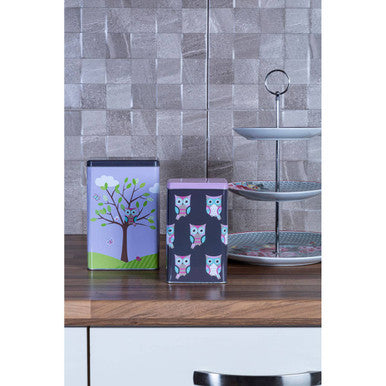 These pretty pastel-toned tins feature a collection of cute owls on their surface. The large tin boasts a nature scene with an owl perched upon a large tree backed with blue skies and fluffy clouds. The dark background on the smaller tin makes the colours of the owls more prominent. Made from tin, these are sturdy and durable accent pieces.