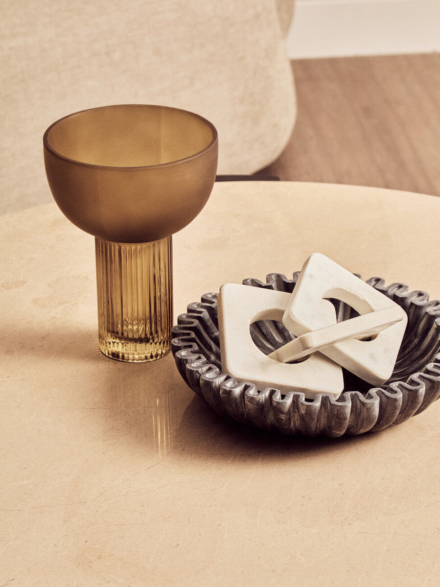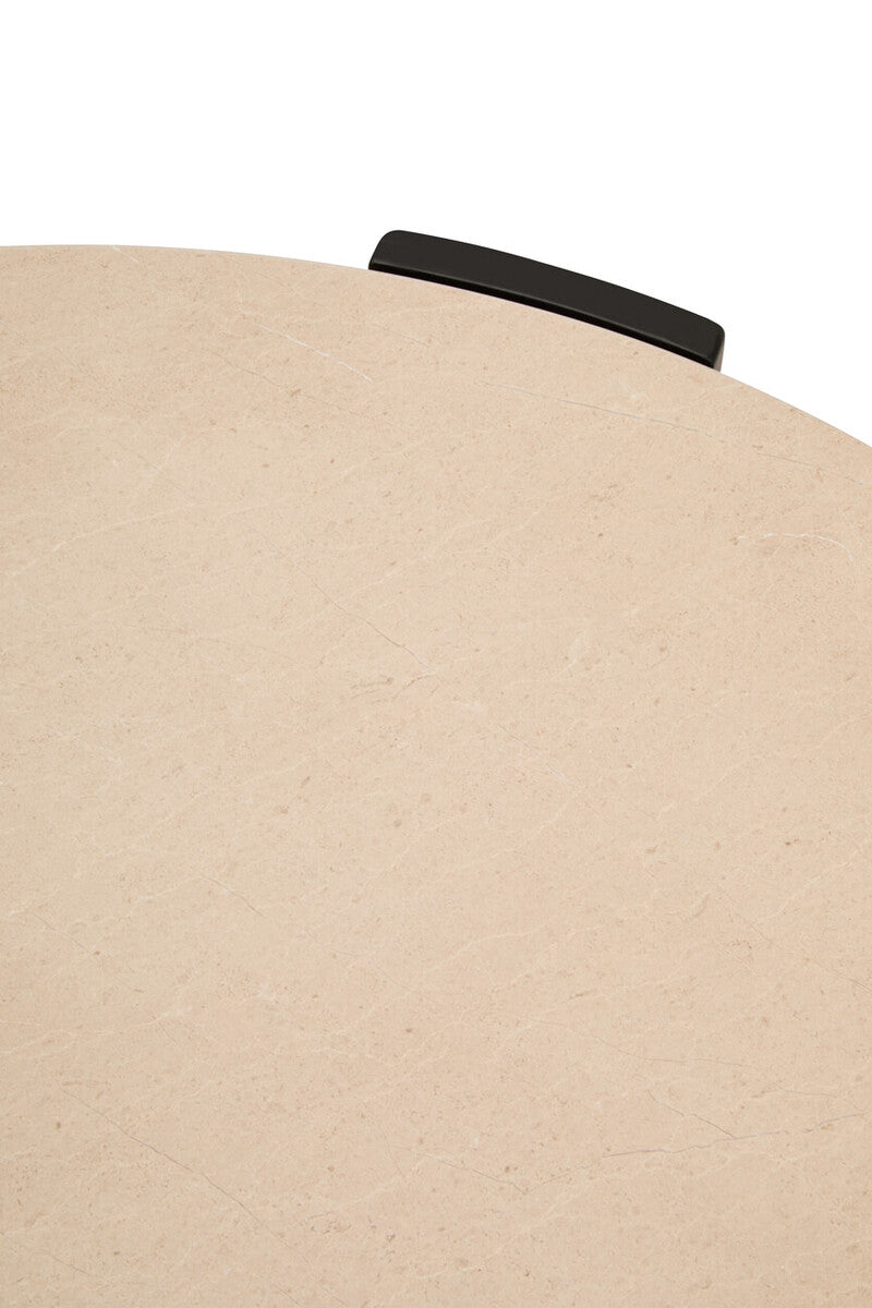 A beautifully honed cream marble tabletop brings warmth and light to your room, showcasing naturally occurring veining and colour variation. The darker structural details (in a sleek black finish) frame the stone and create a contemporary two-tone look that coordinates effortlessly with neutral palettes, black hardware, or mixed metals.