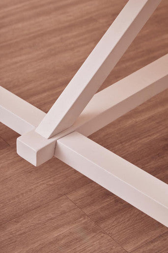 A sculpted birch base in clean white introduces gentle curves and airy lines, giving this rectangular table a fresh farmhouse-meets-modern profile that works with benches or upholstered chairs.