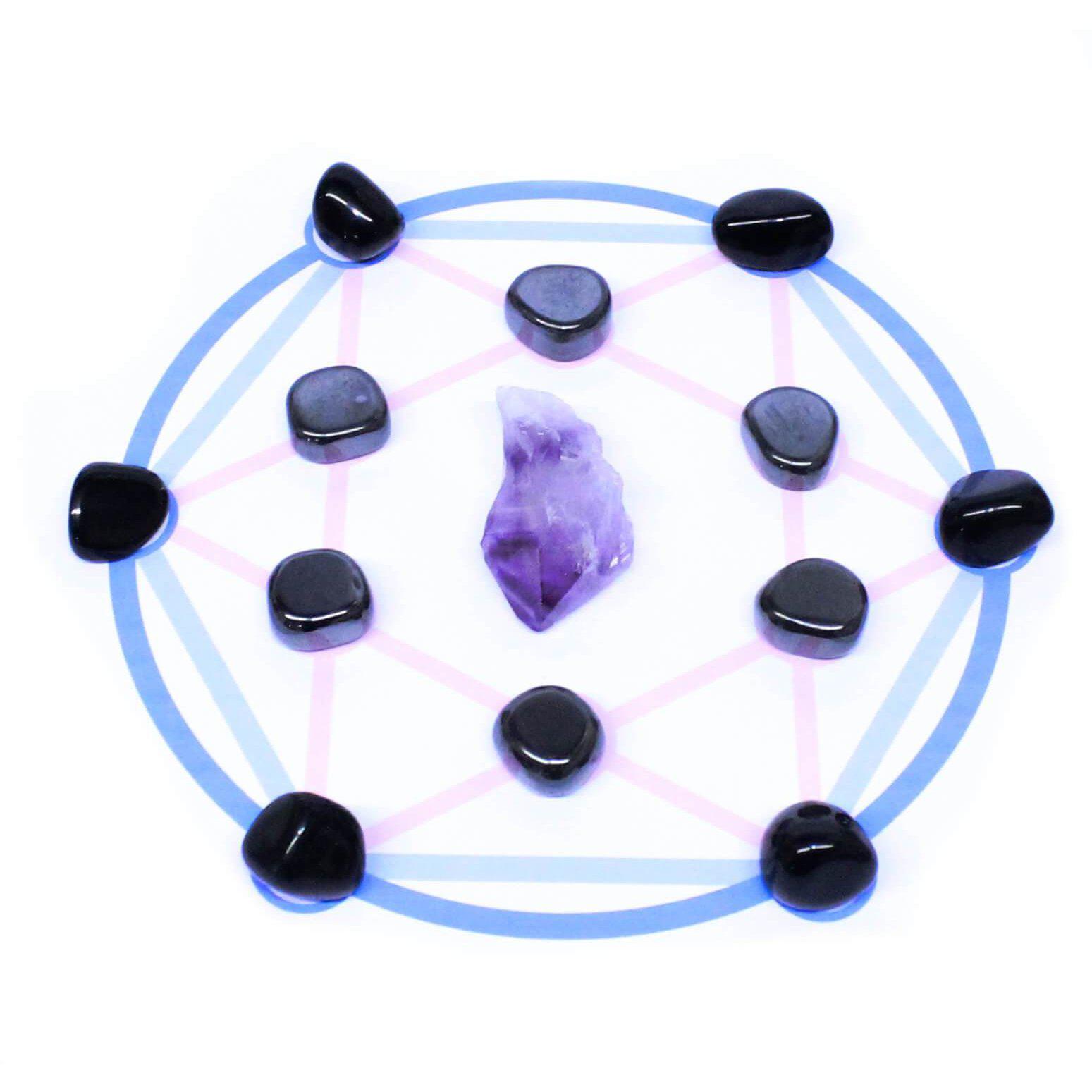 The crystals have been selected and the layout of the grid has been designed with protection in mind. The Amethyst Crystal Point should be placed at the centre of the grid and the other crystals in a fashion of your choosing, but you can follow the example in our photo if you wish (This one works for us!)