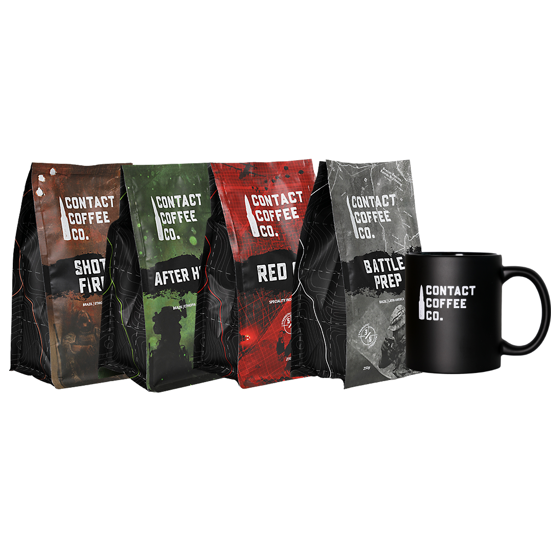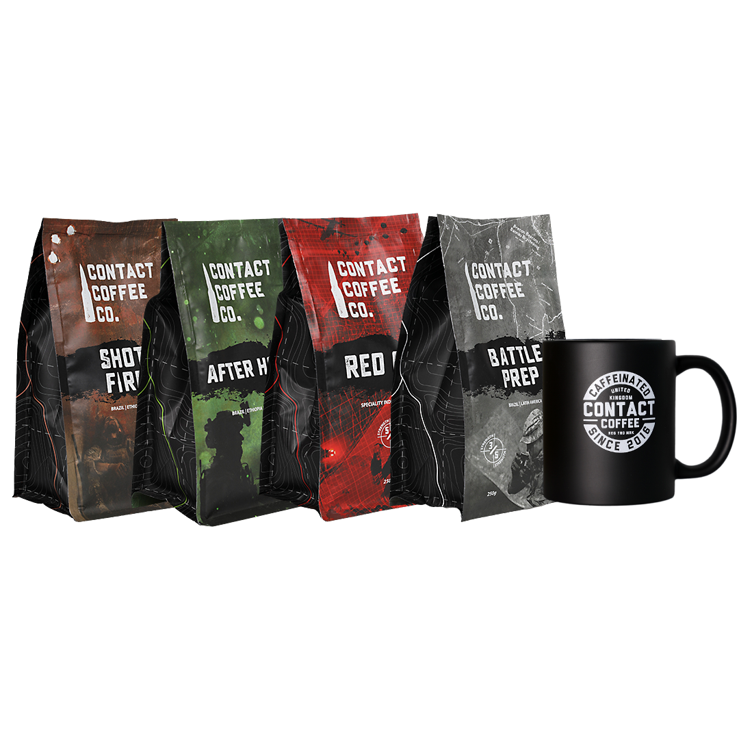 Our Recce Party comes with four of our best selling coffees, including a free mug of your choice. The perfect bundle to keep you going for a month, or a nice gift for a coffee enthusiast!