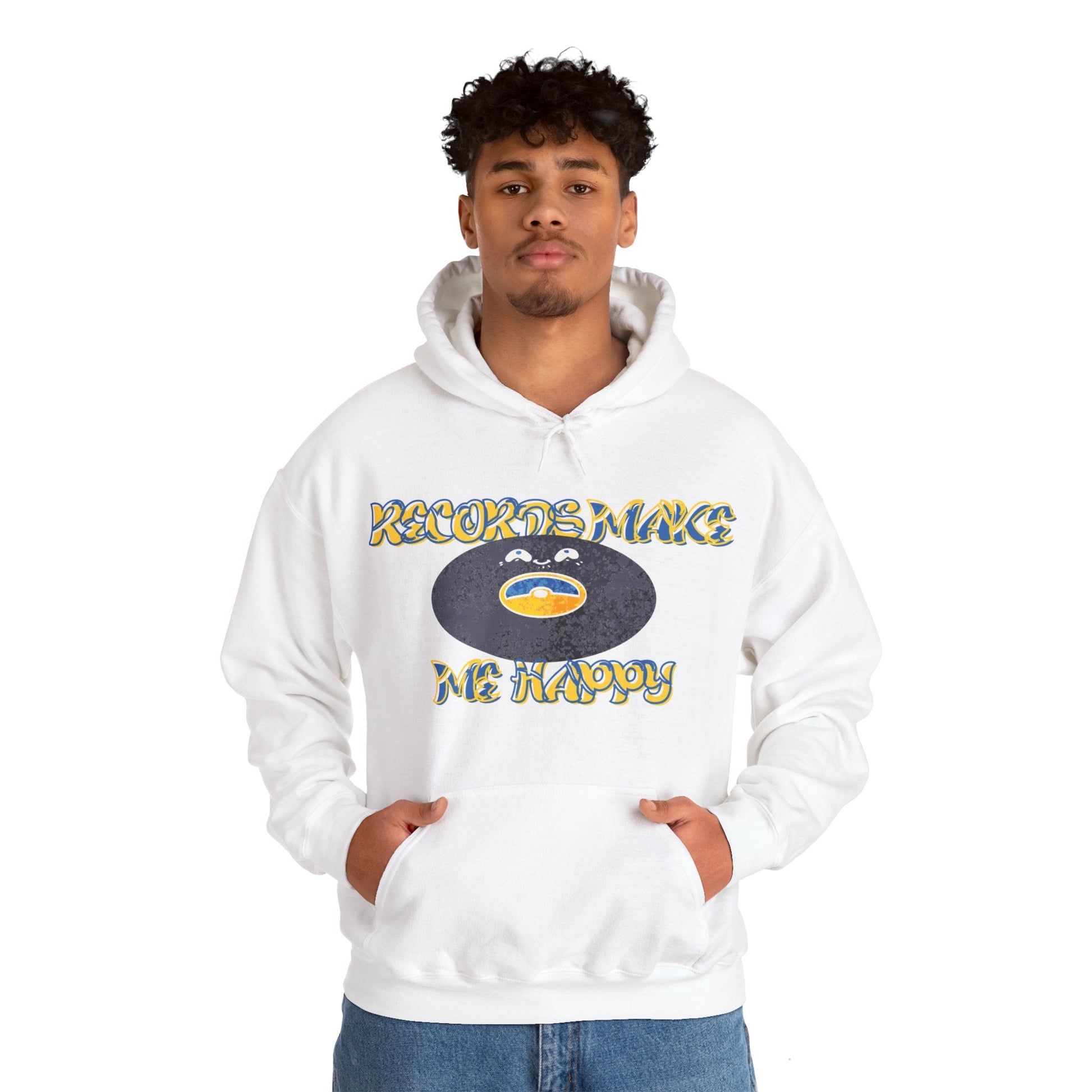 Records make me happy! Show your love for vinyl records with this fun and comfy hoodie. Made with a thick blend of cotton and polyester, it feels plush, soft and warm, a perfect choice for any cold day. In the front, the spacious kangaroo pocket adds daily practicality while the hood's drawstring is the same colour as the base sweater for extra style points.