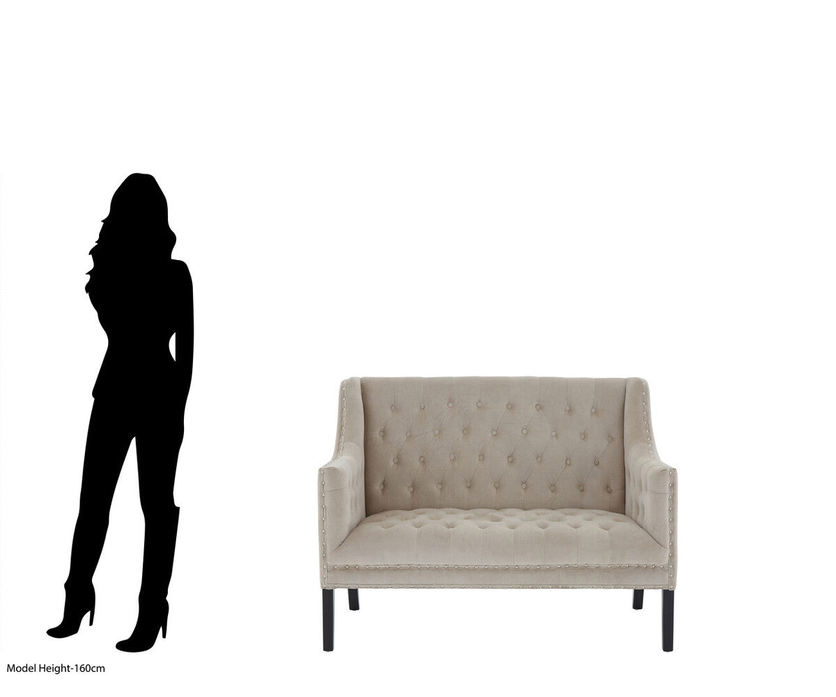 Resting on four slim birchwood legs, this elegant sofa will complement a Boutique-themed setting. The black legs contrast with the light, camel-coloured upholstery. Tufted cushioning on the seat and back add to its opulent look.