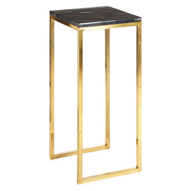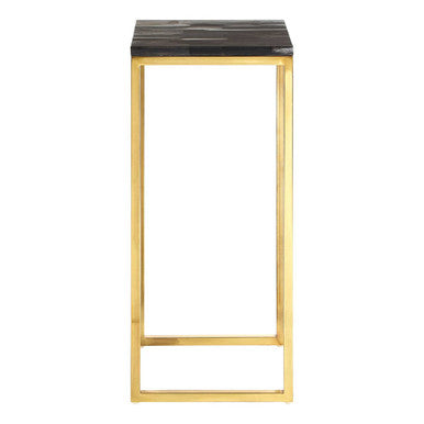 Its sleek base is made from smooth iron, and boasts a rich brass finish that coordinates with warm metallics. A square slab of petrified wood sits atop the frame. The wood, formed over millions of years, allows one to introduce a unique and ancient form into a contemporary design setting. Its black colour counterpoints the brass tones.