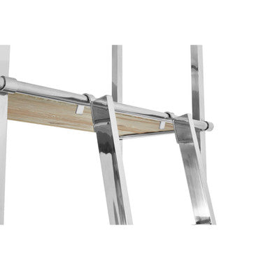 Its base and shelves are made from whitewashed pine wood. Two large storage drawers are integrated into the design. The silver finish stainless steel frame features a moveable ladder to help reach those top sections.