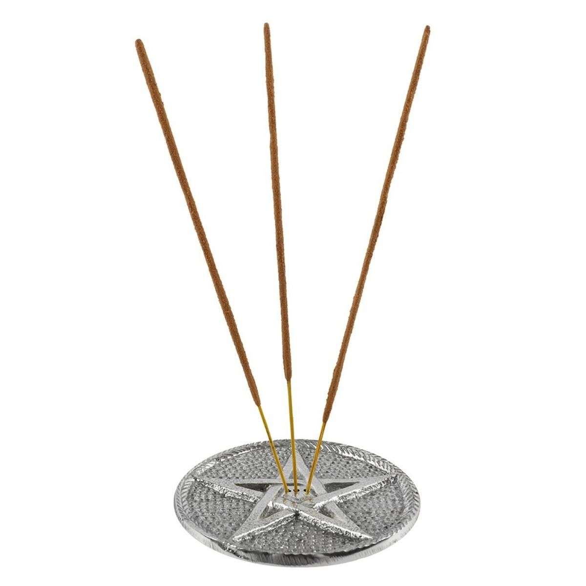 This silver-toned incense holder features a detailed pentagram design accented with swirls and dots.