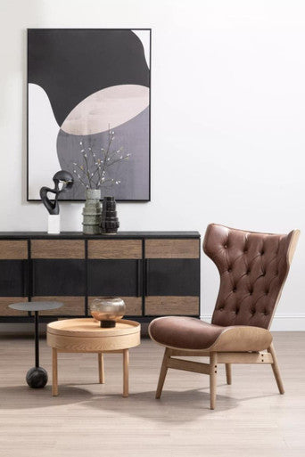 This side table has a revolving top that increases its utility. The table embraces a minimalist aesthetic with a smooth and unadorned natural wood veneer which allows it to blend in any decor.