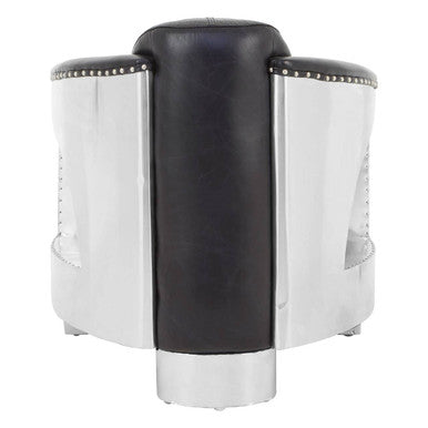 The Victor armchair brings cockpit-style seating to contemporary settings. Its leather upholstery has a retro channel tufted design and is wrapped up in reflective aluminium. Stud detail adds a further metallic accent.