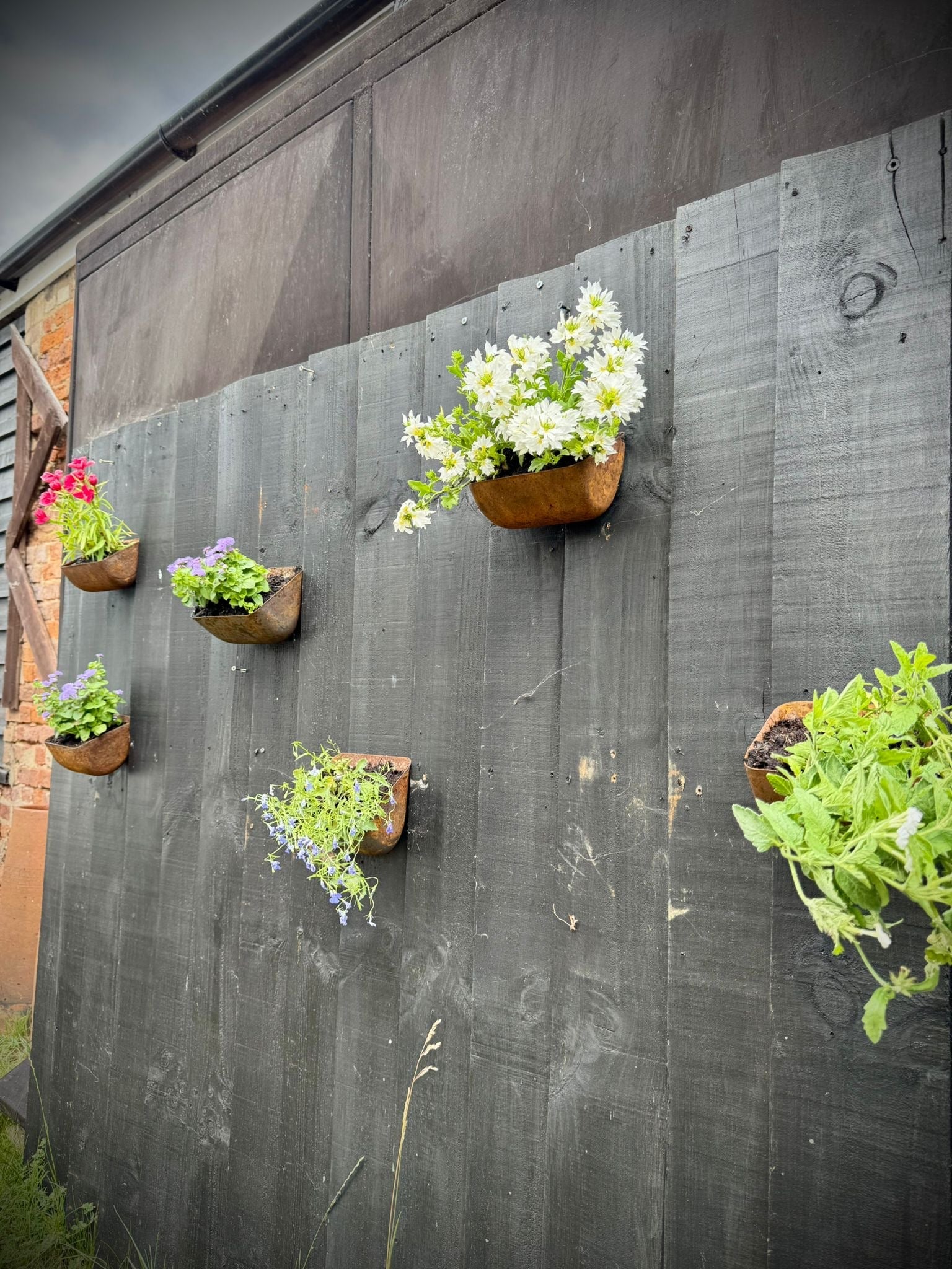 Now, they’ve been cleverly repurposed as rustic wall planters, giving them a second life in gardens, courtyards, or interiors. Their authentic weathered patina and functional form make them ideal for herbs, flowers, succulents, or trailing plants.