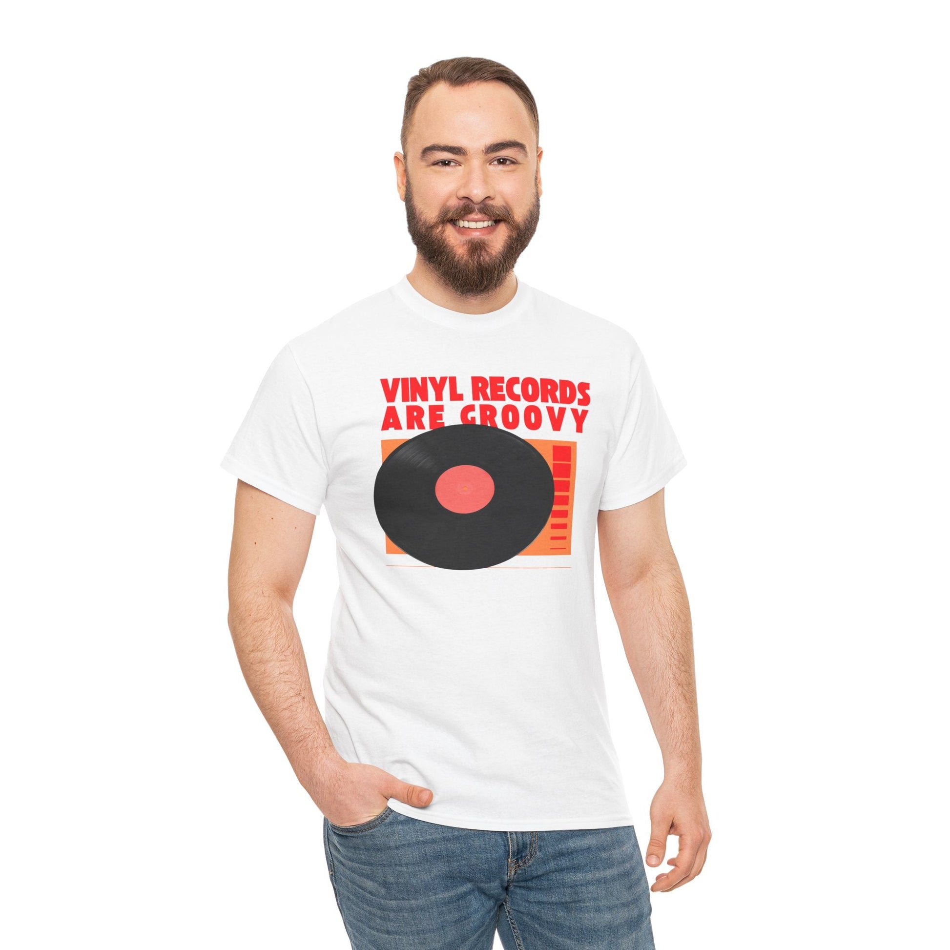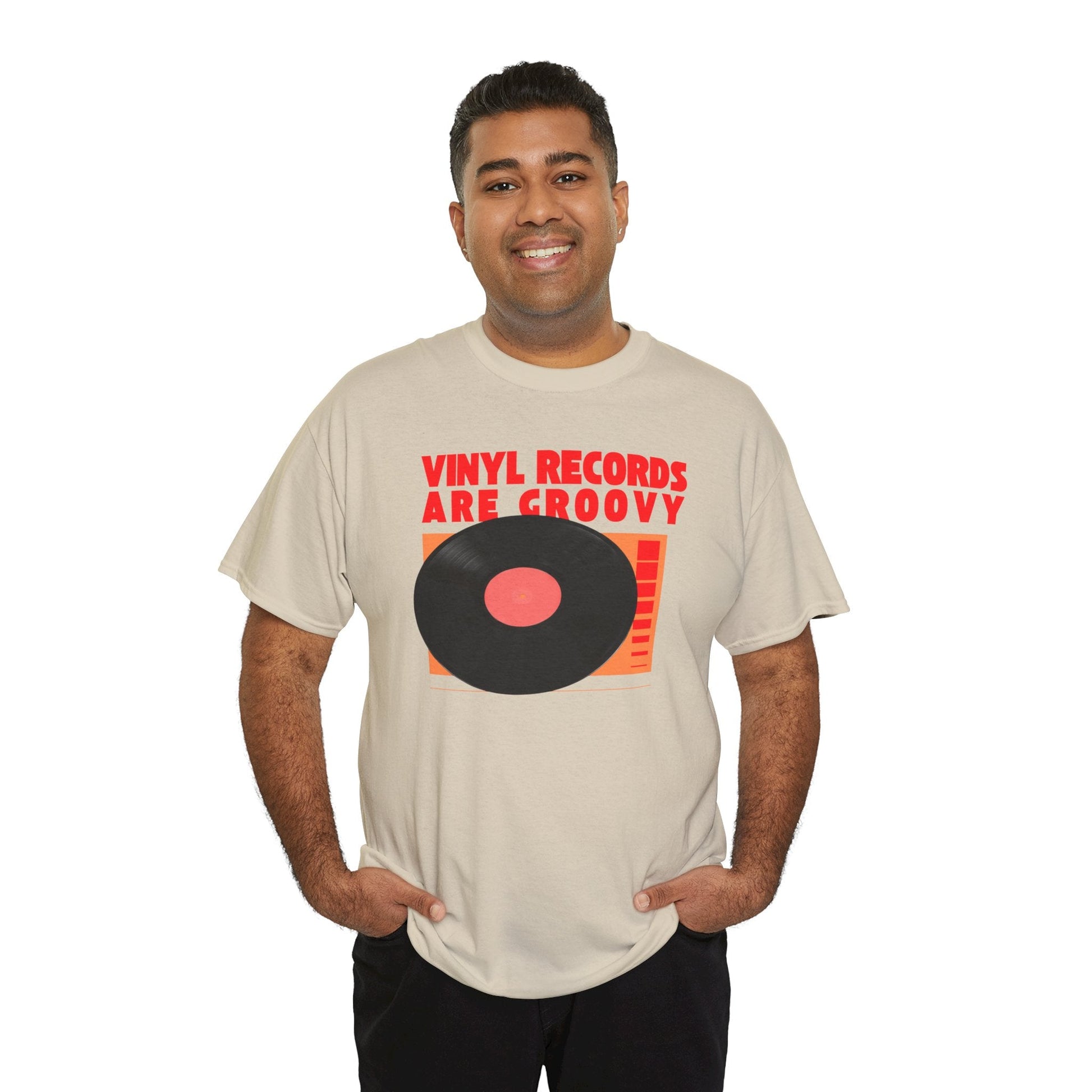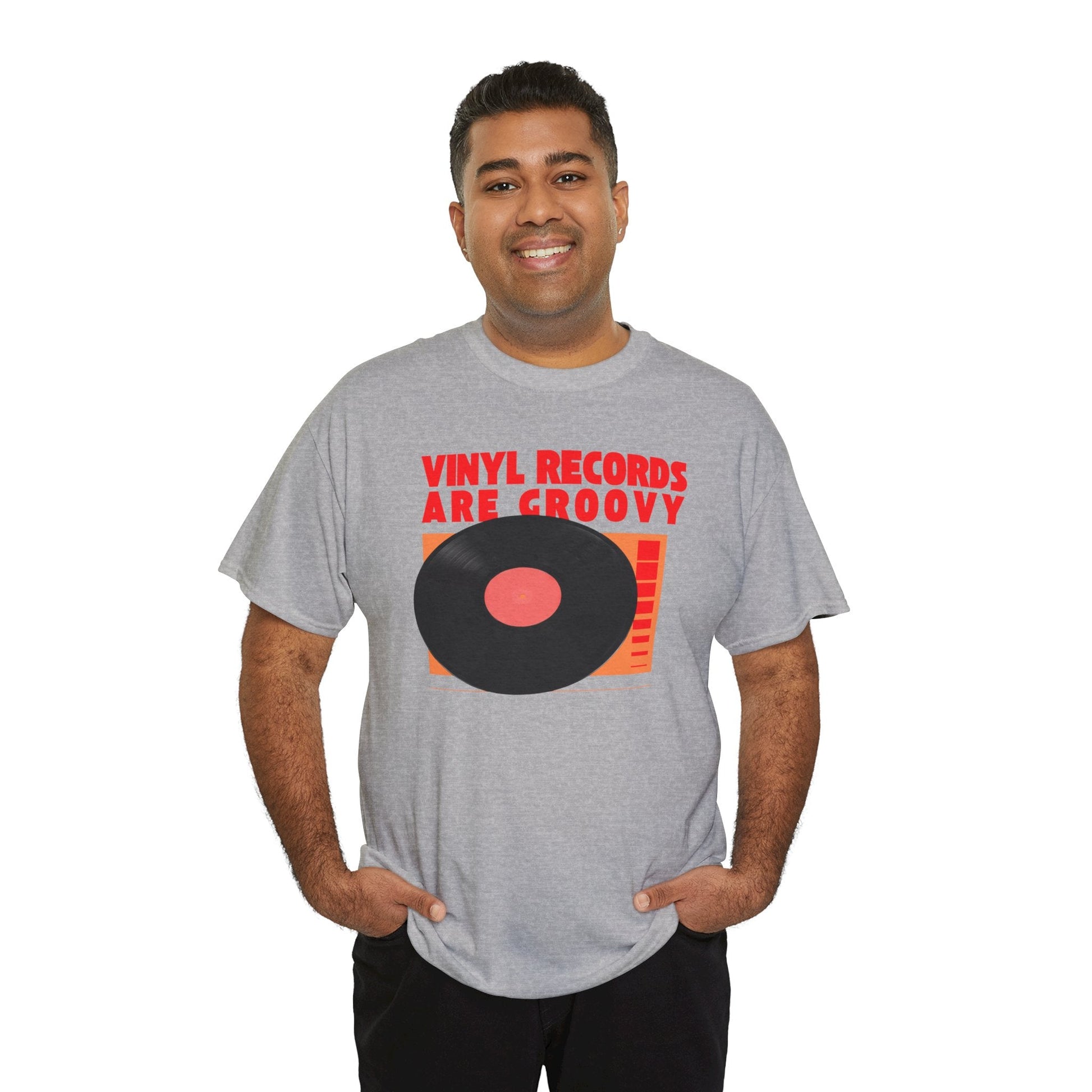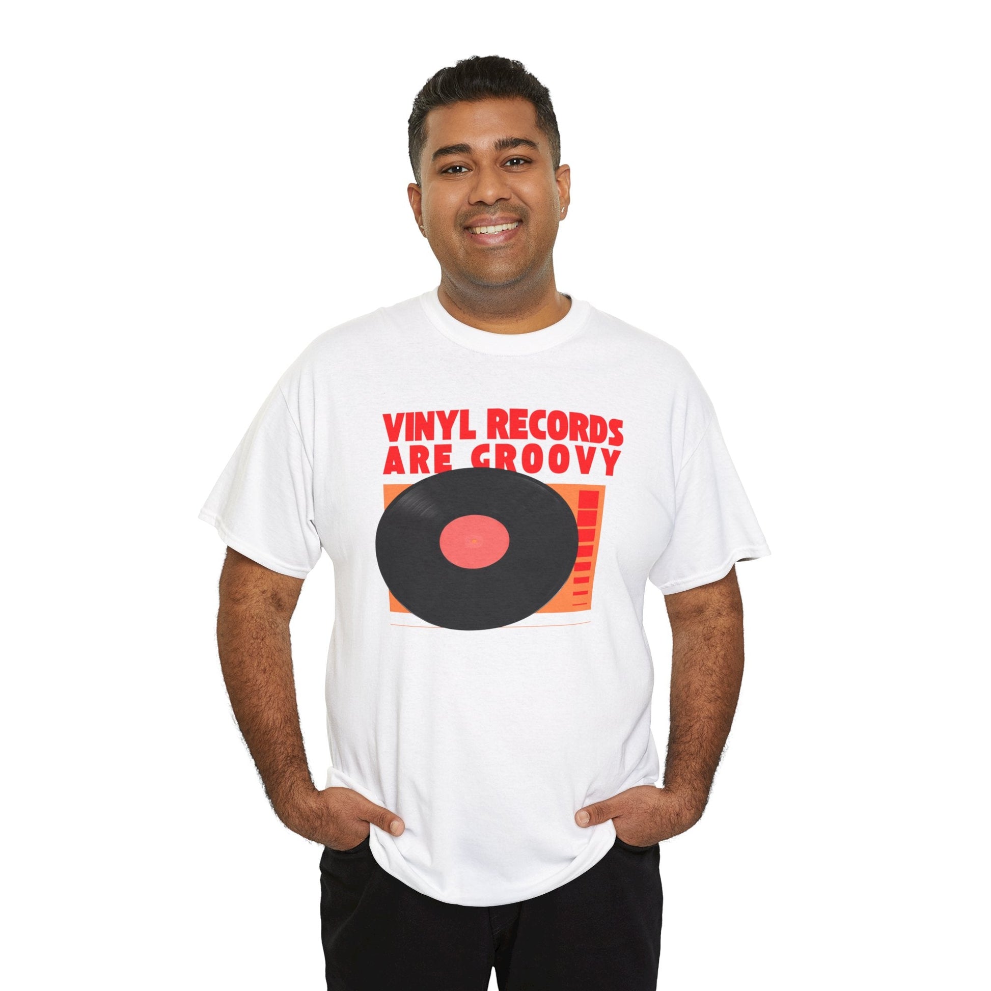 Vinyl records are groovy! Get it? Show your love for vinyl records with this fun and comfy tee. The classic fit makes it perfect for music enthusiasts and fans of retro style. Ideal for casual wear or music events, this tee is durable and suitable for everyday wear or concerts.
