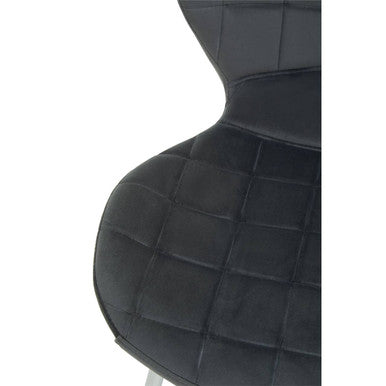 This dining chair is upholstered in sumptuous grey velvet. The quilted seat and backrest of this chair are enhanced by fine stitching. The chair is complete with splayed silver finish legs, contributing to the clean aesthetic of the modern design.
