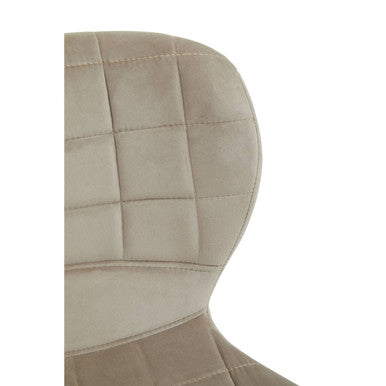 This bar chair is upholstered in sumptuous mink velvet. The quilted seat and backrest of this chair are enhanced by fine stitching. The chair is complete with splayed gold finish legs and footrests, contributing to the clean aesthetic of the modern design.