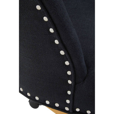 This chair is upholstered in plush black fabric with dense foam padding to provide a cosy seating experience. The stud trim detail at the front adds a contemporary appeal to the design, and the swivel wooden base with castors offers swift manoeuvrability.
